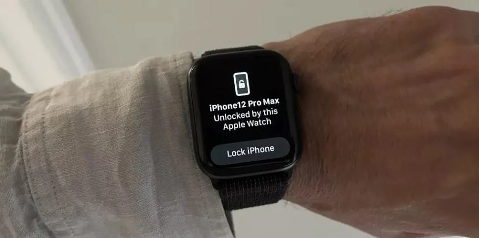 Sekarang lihat layar iPhone kamu, yang seharusnya terbuka dengan cepat. Pergelangan tangan kamu akan bergetar dan “[nama kamu] iPhone” akan muncul di layar Apple Watch. Dibuka oleh Apple Watch “dengan tombol” Kunci iPhone “di bawah pesan ini.