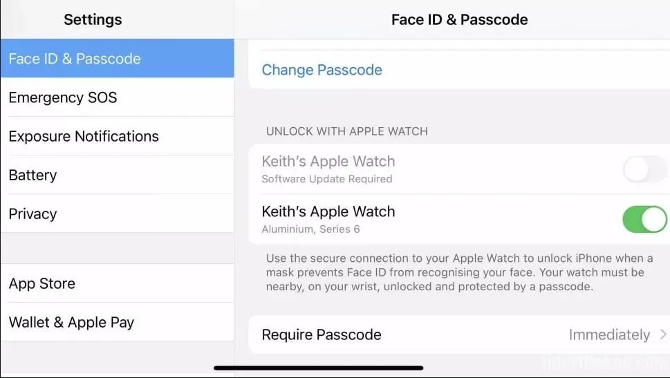 Buka aplikasi Pengaturan iPhone dan buka ‘FACE ID’ & amp; Kode akses. Jika kamu telah menyelaraskan Apple Watch kamu dengan iPhone ini, itu akan muncul di bawah “Buka kunci dengan Apple Watch”. Jika kamu belum menginstal watchOS 7.4, kamu akan melihat “Perlu Pembaruan Perangkat Lunak” di bawahnya.