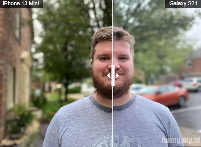 Untuk potret, kedua ponsel ini cukup mirip lagi. IPhone 13 mini memilih rona yang sedikit lebih hangat untuk melengkapi pencahayaan hari itu, sementara Galaxy S21 mendinginkan segalanya dan mencerahkan gambar akhir. Tidak hanya hijau pada gambar iPhone yang lebih kaya, tetapi mobil oranye di belakang saya terlihat mencolok. Mobil yang sama dalam potret S21 terlihat sedikit pudar. Namun, kedua ponsel mencapai rasio blur yang hampir sempurna, meskipun S21 menerapkan terlalu banyak penghalusan wajah.