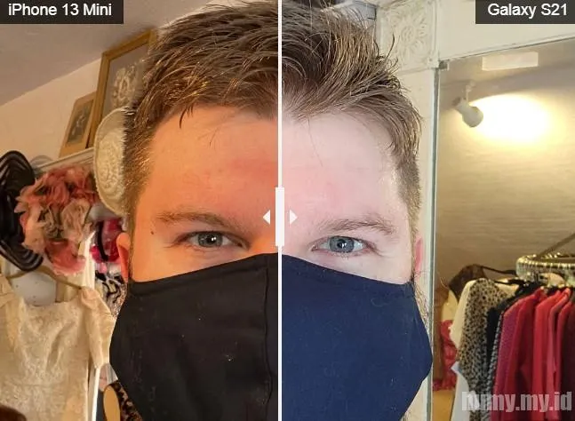 Mengakhiri perbandingan kamera depan, kedua ponsel mengambil dua pendekatan yang sangat berbeda. IPhone 13 mini memilih nada yang lebih lembut dan lebih hangat, memunculkan warna merah di wajah saya dan pakaian di belakang saya. Galaxy S21 mendinginkan segalanya dan mencerahkannya secara signifikan, membuat mata saya lebih cerah, tetapi juga menerapkan terlalu banyak perataan wajah.
