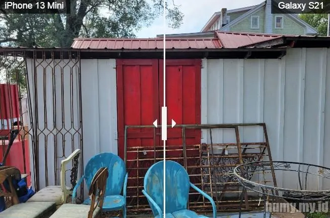 Dalam pemotretan outdoor pertama ini, ponsel harus menangkap kursi biru, pintu merah cerah, dinding putih, dan langit mendung di luar. IPhone 13 mini memiliki gambar yang jauh lebih kaya dengan warna yang lebih cerah dan kedalaman yang lebih baik. Galaxy S21 terlihat sedikit usang dan datar dibandingkan. Kedua gambar tersebut sebenarnya sangat mirip, meskipun menurut saya iPhone lebih realistis.