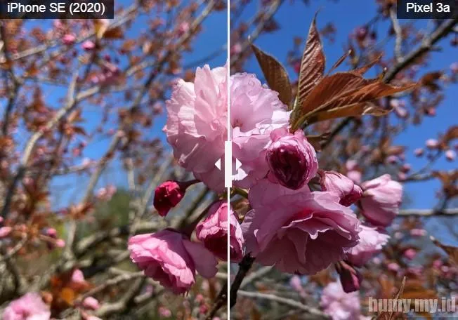 IPhone SE berdiri di depan Pixel 3a dalam foto bunga sakura merah muda muda ini. Bidikan iPhone SE lebih hangat dan cerah, tetapi gambar Pixel 3a sedikit lebih detail dan lebih kontras.