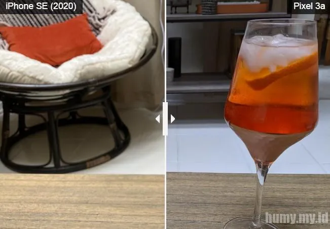 IPhone SE memimpin dalam pengambilan koktail Aperol Sprtiz ini. Gambar keseluruhan tampak lebih cerah dan lebih menggugah selera. Saya juga suka cara iPhone SE mengaburkan latar belakang. Satu-satunya downside ke iPhone di sini adalah ubin terlihat lebih kuning daripada putih; Pixel 3a berkinerja baik.