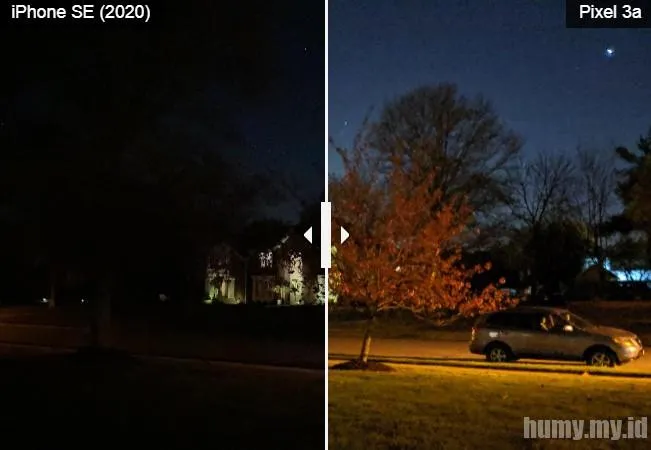 Satu-satunya titik lemah dari kamera iPhone SE adalah tidak adanya mode malam. Dalam foto yang diambil di luar ruangan pada malam hari ini, Pixel 3a dapat menampilkan pepohonan di latar depan, mobil di jalan, dan rumah di latar belakang. Anda hampir tidak dapat melihat apa pun di bingkai iPhone SE. Saya tidak tahu apakah iPhone SE dapat mencapai mode malam dengan pembaruan perangkat lunak, tetapi akan menyenangkan melihat Apple menambahkan fitur tersebut.