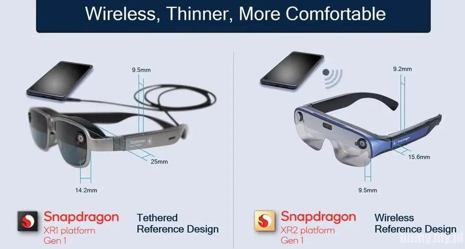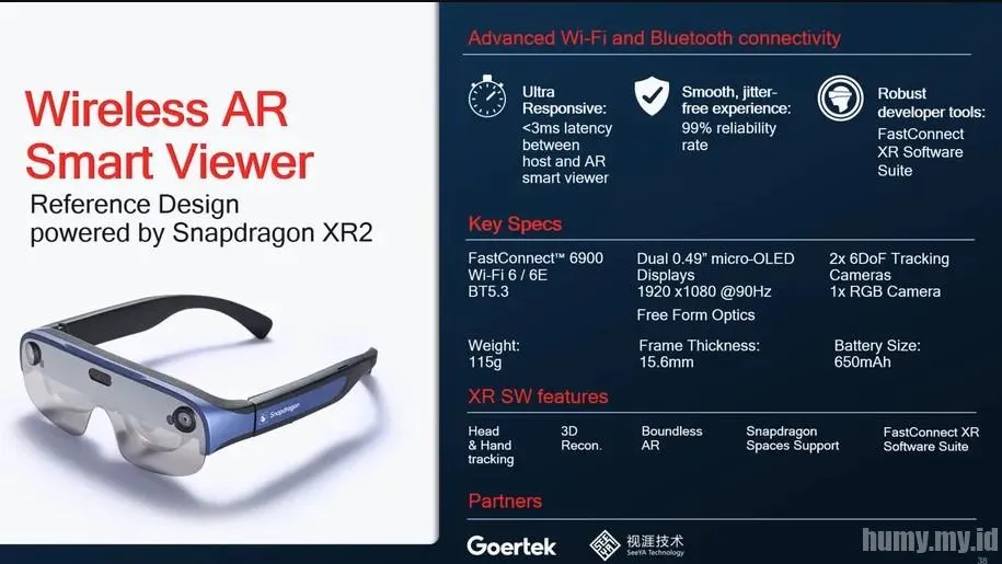 Qualcomm memperkenalkan versi nirkabel dari Smart Viewer augmented reality-nya, sebuah desain referensi yang juga dapat diadaptasi oleh produsen untuk headset komersial. Wireless AR Smart Viewer memperbarui desain kacamata pintar Qualcomm sebelumnya dengan chipset yang lebih kuat dan sistem berbagi yang menggunakan Wi-Fi 6/6E dan Bluetooth, bukan kabel USB-C. Ini adalah trade-off antara masa pakai baterai yang berpotensi sangat singkat, meskipun Qualcomm mengatakan versi siap pakai dapat dibuat secara berbeda.