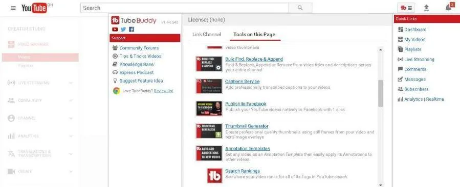 TubeBuddy adalah alat YouTube favorit saya yang berfungsi sebagai pengelola saluran dan alat pengoptimalan video, menjadikannya suatu keharusan bagi pembuat konten YouTube. Ini menambahkan banyak fitur di atas YouTube, seperti: